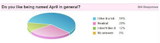 I also stumbled upon this very interesting site, in which parents could get ideas in naming their newborn babies. I found some information gathered fromt the web site's name survey where people with name April were asked if they like their name. 864 people answered the survey and the feedback follows: